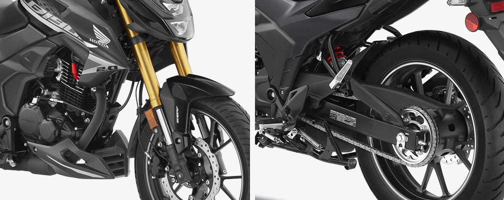 Equipada con suspensión Showa, la horquilla delantera invertida y el amortiguador trasero ofrecen un excelente equilibrio entre confort y control. Su puesta a punto permite absorber las irregularidades del asfalto con suavidad y mantener una respuesta firme en la conducción urbana.