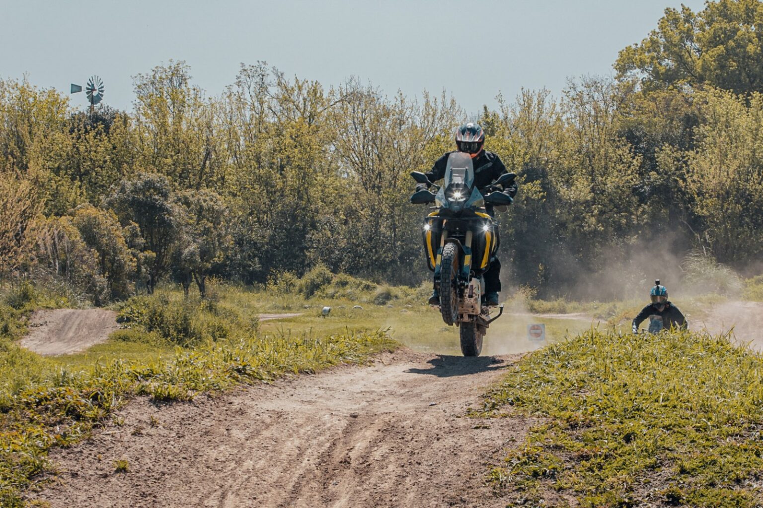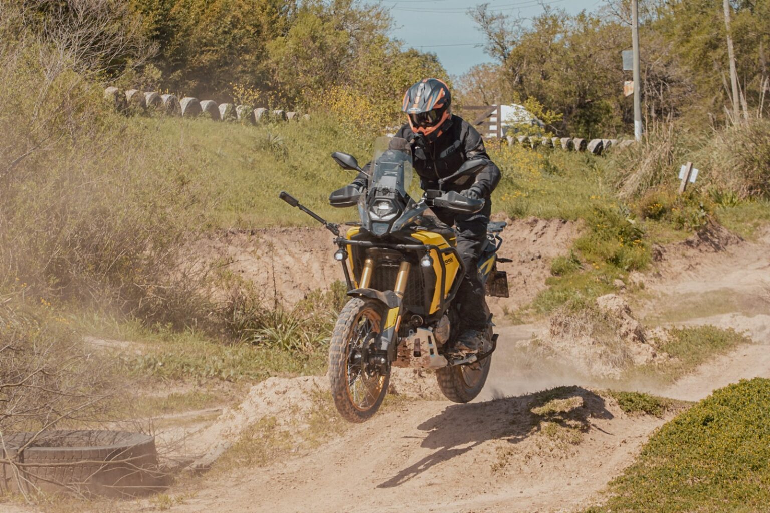 Después están las suspensiones, KYB totalmente regulables adelante y atrás con 200 mm de recorrido, para una moto con un despeje mínimo al suelo de 220 mm. De nuevo, no es la de mayor recorrido de suspensiones, pero el hecho de poder ajustar el hidráulico y la precarga para aquellos que quieren exigir más la moto es un gran punto a favor. Y en las imágenes van a ver que a la moto se la exigió bastante.